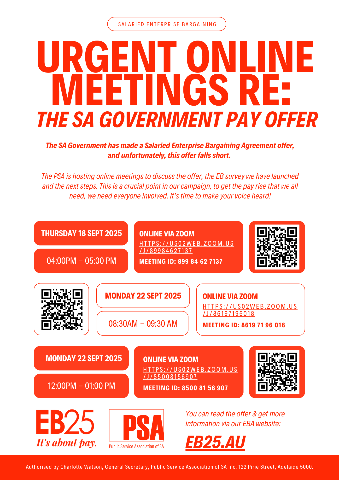 In response to the SA Government's offer, the PSA is hosting online meetings to discuss the offer, the EB survey that we have launched and the next steps from here.