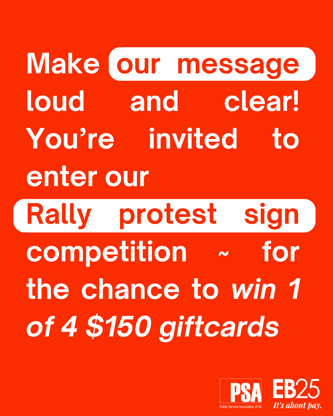 4. We’re also encouraging you to snap a photo at the rally, post on social media tag the PSA & use #EB25. Please note only public posts will be considered as entries.